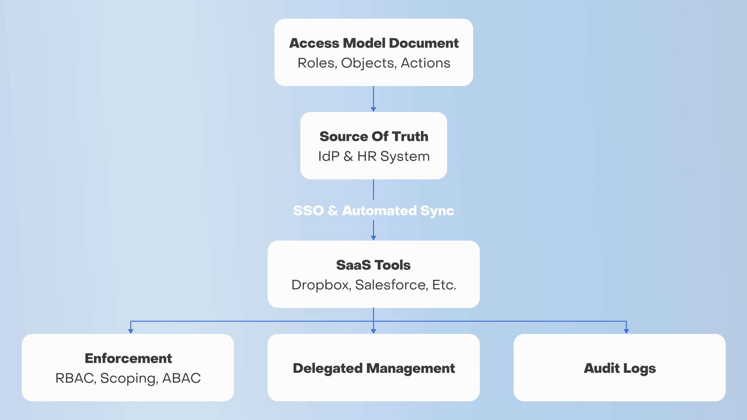 Your Identity Provider (IdP) is the central hub for everyone in your company. It knows their name, email, job role, and team. When you have a solid access model, your IdP should be the single source of truth that your software listens to. This is the same Source of Truth you see in the diagram.